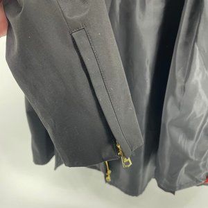 Stylish black short belted trench coat with zip front, size M.
