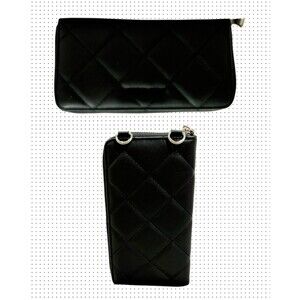 The Steve Madden Black Gray BEMMET Pouch WALLET Wristlet Trio CROSSBODY Bag is a stylish and functional small shoulder bag designed for women. Featuring a solid black exterior with silver hardware accents, this bag includes a zip closure and a Guitar crossbody strap handle in black canvas material. The bag has a sleek design, with a pouch character and inner pockets for organization. It also comes with credit card slots and an adjustable strap for added convenience. Perfect for on-the-go use, this polyurethane bag is a fashionable accessory for any outfit. Excellent condition.