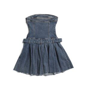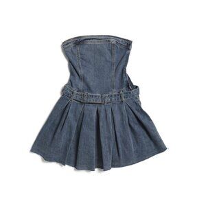 denim finish, raw hem, belted waist, contrast stitching, fabric provides stretch, pleated skirt