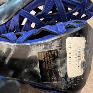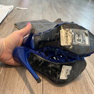 STEVE MADDEN ~ Style Bratt ~ 5.5" stilettos in cobalt blue suede with triangular cut outs in a caged design. Peep toe with an elastic slingback and shiny heel. Front platform is 0.5" in height. No box.