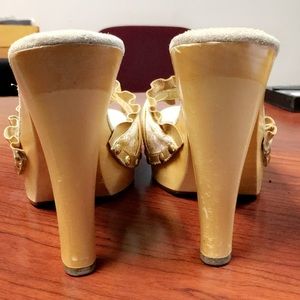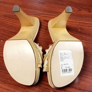 Description: beautiful gold tone fabric upper and leather outsole. Size 6.5 fits sizes 6 to 6.5 ~ no box