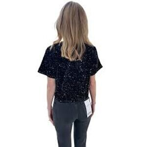 This Steve Madden top is made from velvet polyester with sequin embellishments. It features a crew neckline, short sleeves, and a pullover design. The approximate length is 19.5 inches. Made from 100% polyester material, with a 95% nylon and 5% elastane lining. It requires hand wash and is made in China.