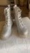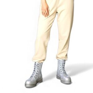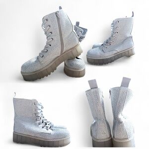 Allover dazzling silver rhinestones cover the glitter combat boots with platform chunky lug soles for added height & edgy look. Lace up, Side zipper closure Perfect for adding sparkle to any outfit. Minor scuff mark see photo/video I showed them, does not effect the beauty of these boots