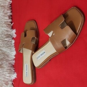 Stylish Steve Madden slides in tan. Ideal for casual wear. Comfortable and trendy.