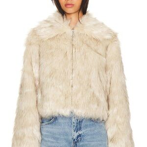 Elevate your style with this luxurious cream faux fur jacket. Perfect for adding a touch of elegance to any outfit.