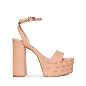 LIA is a monochrome sandal design on a high block heel with a stacked front platform.