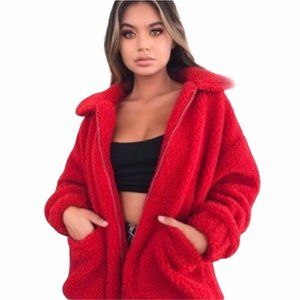 Oversized cozy teddy faux shearling Steve Madden jacket in cherry red