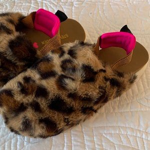 How cute! Stay comfortable and fashionable in these slip on shoes, a perfect option for days spent doing casual activities. Designed with a leopard faux fur upper material and an bright pink elastic slingback for security, this style is cozy and cute, complete with a padded sock footbed and a flexible rubber outsole.