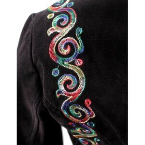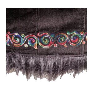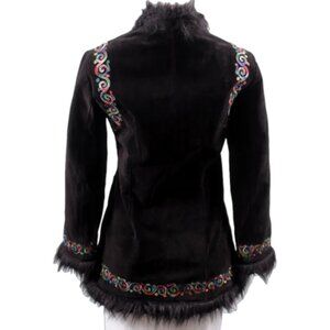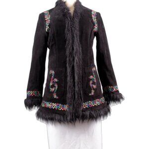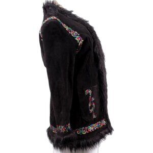 Black Steve Madden suede jacket has faux fur trim throughout, embroidery detail, 2 front pockets and hidden hook and eye closures.