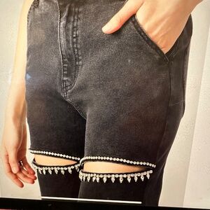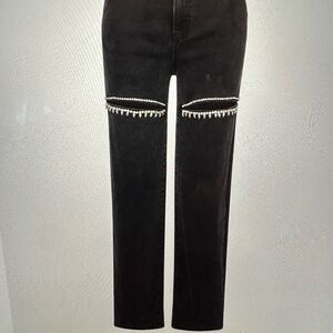 The TAYLOR jeans offer a stylish twist on a classic design. Boasting a wide-leg fit, these jeans provide comfort and versatility, while the intricate rhinestone trim cutouts at the thighs add a touch of glamour.