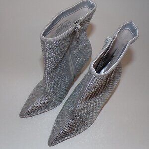 Poised to make a party-ready statement, this sparkling bootie is sculpted with a sleek pointy toe and striking flared heel. Best for a 5.5 - 6 foot.