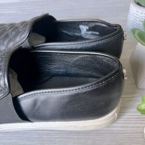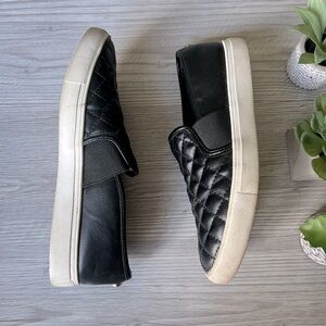 Steve Madden Ennore sneakers. Slip-on style with side goring. Lightly cushioned footbed. Black quilted onsole. White sole. Silver Steve Madden medallion on back heel. Womens size 9. No shoebox included.