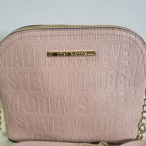 Steve Madden Blush Pink Gold Chain Faux Leather Crossbody Bag Purse. Embossed Steve Madden imprint all over bag, 100% polyurethane bag & black trim, gold hardware & accents, gold emblem logo, open pocket on side of bag, top zip closure, interior slip pocket & 1 zip pocket, 100% polyester logo black interior lining, 23" partial gold chain strap drop, approximately 10" X 7.25" X 3.5" bag size. No rips or stains. Like new condition!