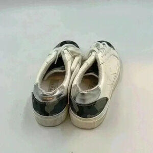 Steve Madden sneakers- white with camo accent on toe, silver accent back of ankle. These are fun! Size 5.5. Synthetic upper and terry lining. Please see photos for details and condition.