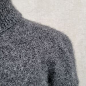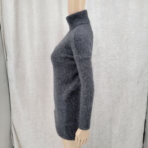Charcoal gray elongated sweater with ribbed turtleneck and cuffs, super soft, spun silk gives an angora like texture. No flaws or visible wear.