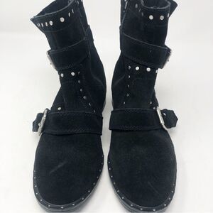 Awesome black suede leather ankle boots by Steven. Silver studs. Silver buckles. Round toe. Worn maybe one time. Great condition - see photos. Womens size 8.5.