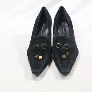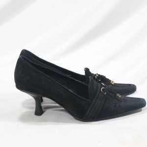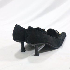 All black suede upper with brass tipped suede laces on the front of the heels. Gently worn sole and heel, no stains, spots, tears, holes, or discoloration. Smoke and pet free!