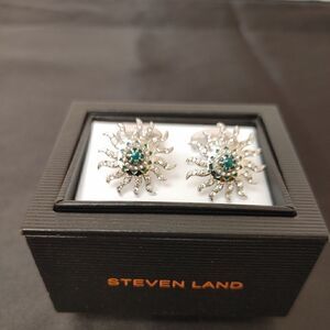 STEVEN LAND CUFFLINKS SET A AZTEC SUN SHAPED SAPPHIRE CRYSTAL GEMSTONES SILVER.