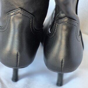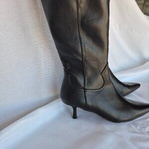 Shaft pull-tabs and tonal stitching detail bring subtle western-inspired flair to a trend-right pointed-toe boot propped on a walkable kitten heel. 2" heel 15" shaft, 14" opening circumference Partial side zip closure Synthetic upper, lining and sole Imported
