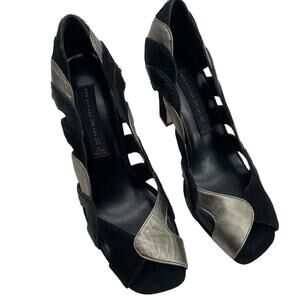 STEVEN Steve Madden Size 6.5 Suede Leather Cutout High Heels Black Silver Fur