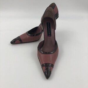 Lovely spectator-style heels in dark pink with brown patent leather trim. Long pointed toes make your feet look extra-slim. Never been worn.