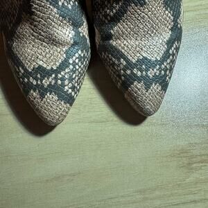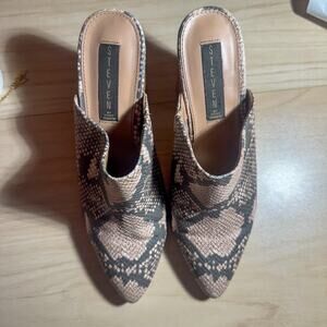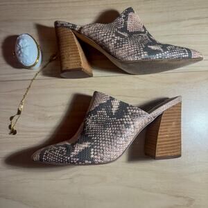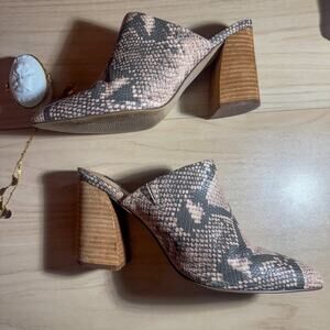 Steven by Steve Madden, mules, snakeskin, snake print, animal print, pointed toe, block heel, chunky heel, wood heel, taupe, beige, neutral, black, brown, heels, slip on, slide, chic, western, western inspired, fashion, street style, Y2K style, 90s style, minimalist, maximalist, contemporary, modern, pre-owned, clogs