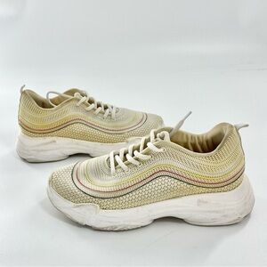 STEVEN by Steve Madden Massey Flocked Leather Neutral Lace-Up Minimal Sneakers in size 8.5. These are a flocked leather (feels like rubber) outer cream off white color with retro yellow and orange stripe. Streetstyle look. These are in pre-owned condition and just need a good washing.