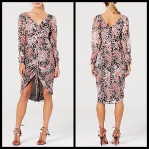 Cut from a stunning printed silk this dress features a v neckline, gathered sleeve heads to create voluminous sleeves, finished with a centre-front functional double drawcord to add gathering in the body. Perfect for spring, summer, or fall party or special event such as a wedding, birthday or date night