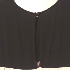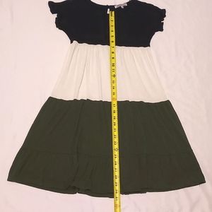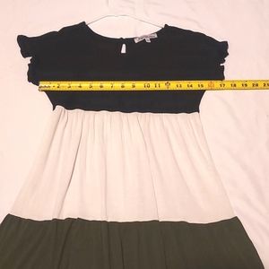 Beautiful Stillettos short sleeve 3 tiered ruffle dress. Top black, middle is off white or light cream, bottom is dark green. So cute! One slip button closure on back of neck with a small open v. Size medium
