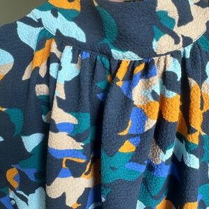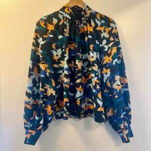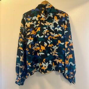 Mock neck, balloon sleeves. Really fun and vibrant print on slightly textured fabric (see close ups).
