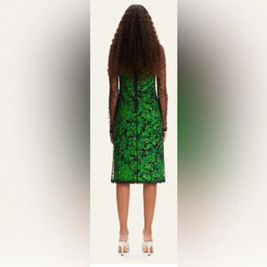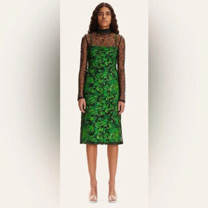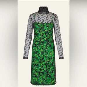 A knee-length slip dress from Stine Goya with a sheer long-sleeved top layer and floral pattern. Modestly sexy, with a little sparkle and shine.