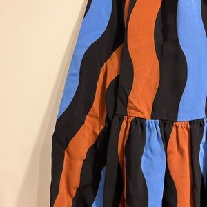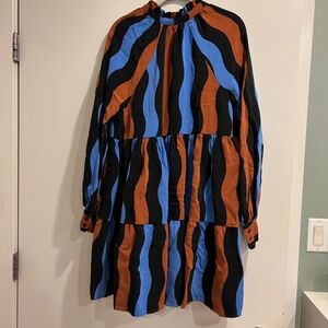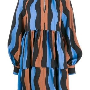 ✨ Bold & Effortlessly Chic! This STINE GOYA Jasmine Dress features vibrant wavy stripes in shades of blue, black, and brown, creating a striking and modern look. The high ruffled neckline adds a regal touch, while the relaxed shift silhouette makes it both comfortable and stylish.