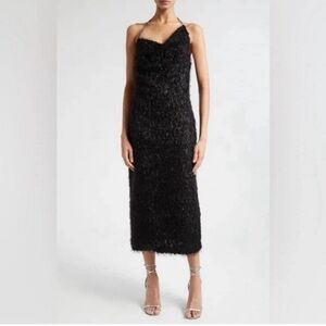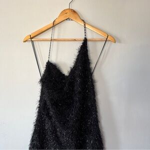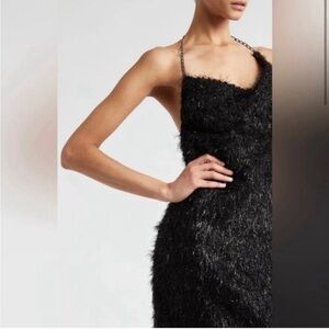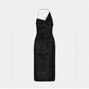FITTED MID-LENGTH KNIT DRESS WITH A SLEEVELESS BACKLESS CUT, CHAIN HALTER DETAIL AND SHIMMERY FLUFFY MATERIAL. PAIR WITH THE PIZA HEELS IN JET BLACK.
