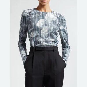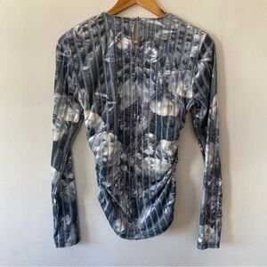 Long sleeve top with side ruching, in a floral pattern on semi-sheer ribbed material. Recycled polyester blend.