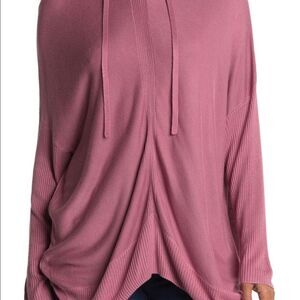 A lightweight pullover hoodie features dolman sleeves, lightweight knit construction, ribbed knit trim, shark bite hem, desert rose, gathered in front and back.
