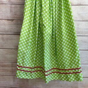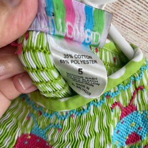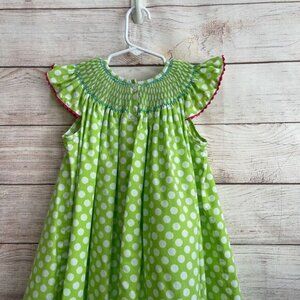 EXCELLENT CONDITION STITCHED AND SMOCKED GREEN AND WHITE POLKA DOT SMOCKED DRESS WITH EMBROIDERED LADYBUGS