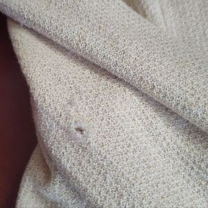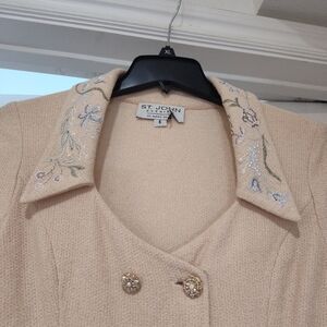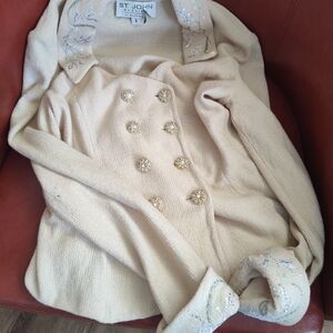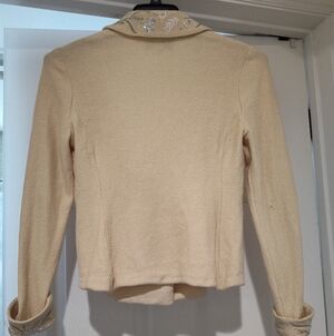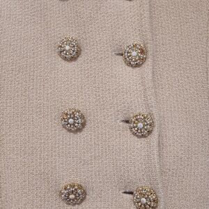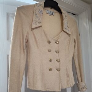 Chic cream blazer with elegant embroidery. Features double-breasted design. Perfect for a sophisticated look three tiny holes used condition see photos accepting offers.
