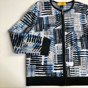 EUC ST JOHN GORGEOUS Zip front sweater. Such quality! Pair with jeans or black pants for a polished look. Classic! Beautiful print. Runs in back shown ( barely noticeable) Great to stay warm in chilly Ac!