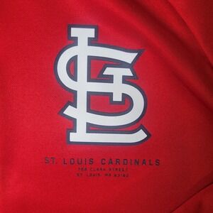 The STL Cardinals Nike 1/4 Zip Pullover is a men's medium Dri-Fit sweatshirt featuring the St. Louis Cardinals team logo, making it an officially licensed Major League Baseball product. Made by Nike in Vietnam, this red sweatshirt is perfect for fans of the Cardinals to wear during the regular season games. The sweatshirt provides comfort and stretch, making it ideal for showing support for your favorite team in style.