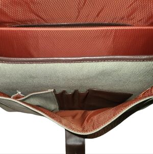 BAG IS BRAND NEW WITH TAGS - only piece used was the laptop sleeve that shows signs of wear on handles (see pictures) the bag and cable case have never been used. Small flaw on bottom of bag which looks like a glue spot (see pictures)