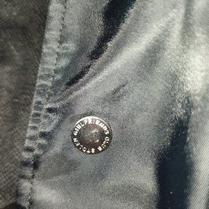 Long sleeve technical satin jacket in black. Spread collar. Press-stud closure at front. Logo bonded in white at chest and back. Zippered pocket at sleeve. Welt pockets at waist. Logo-woven webbing drawstring at hem. Detachable and adjustable webbing strap featuring strap pad and bonded logo pattern in white at interior. Tonal mesh lining. Logo-engraved silver-tone hardware.
