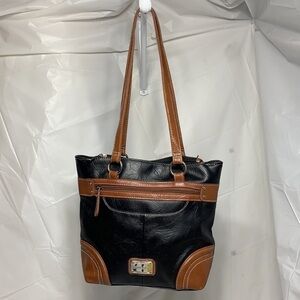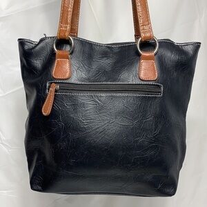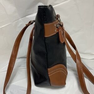 Stone & Co Black and Dark Tan Faux Leather Hobo with Magnetic Snap Closure. 2 side pouches with zipper closures.