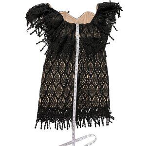 Stone Cold Fox Black Coctail Party Mini Dress Lace Overlay Off the Shoulder 1. This is a size 1. Pit to pit measures 12 inches. Length of dress measures 23 inches. See photos for measurements. Lining is made of silk. Overlay is Rayon blend ace with fringe accent. Contrast under lay is linen spandex blend and is a nude color. This dress is perfect for the upcoming holiday parties.
