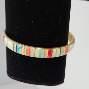 STONE Colorful Mosaic Bangle Bracelet. This is an amazing bracelet. It is colorful and in great condition, in my opinion. You can run your fingernails over the stones and feel where the different stones start. It's amazing that this is in such great condition it is. The only flaws I could find was the discoloration of the inside, as shown in the photos.