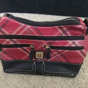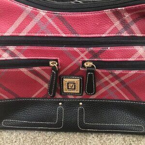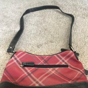 STONE MOUNTAIN LEATHER RED PLAID SHOULDER HANDBAG. LOTS COMPARTMENTS/POCKETS