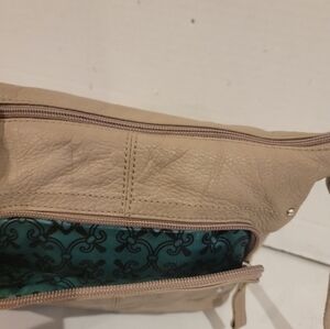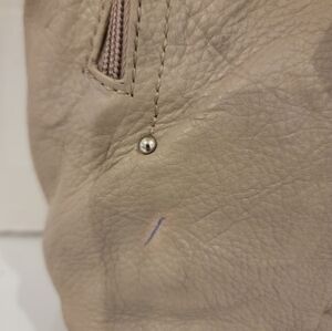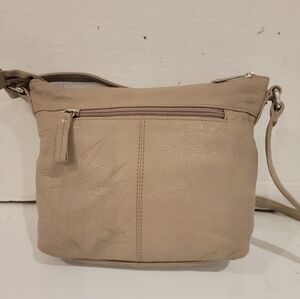 Stone Mountain tan leather crossbody handbag. The bag has a single compartment with a zippered coin pocket & a slide pocket. On both the front and back, there are zippered pockets. There is a 1/2" ink mark on the front of the bag (see pic).