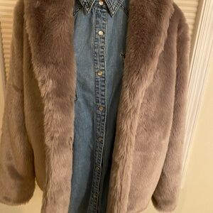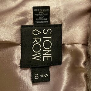 This faux fur jacket is a versatile piece for your wardrobe! It was only worn twice, in excellent condition. Wear it with formal or casual;. It is a light lavender/grey color. It closes with 3 large hook and eyes. This fun jacket is lined with satin. It is labeled Small-Petite, but it is a generous fit. STONE ROW is a high quality brand. This jacket was originally $200. The Jessica McClintock rhinestone bag may come with it, if you wish.