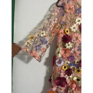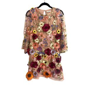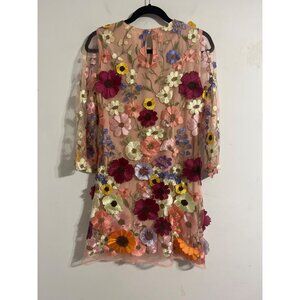 STORIA 3-D Flower Appliqué Sheer Sleeve Mini Dress Pink Multicolor Garden Party size Small