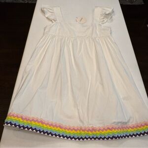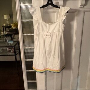 BRAND NEW with tags.womens STORIA dress / bathing suit cover up. White with multi color rick rack trim, Flutter sleeves, short, side zip close. Size medium. See photos for measurements.