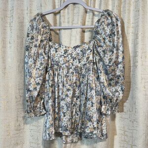 STORIA Floral Puff Sleeve Top Grey White Apricot Flirty Light Cute Women's Small